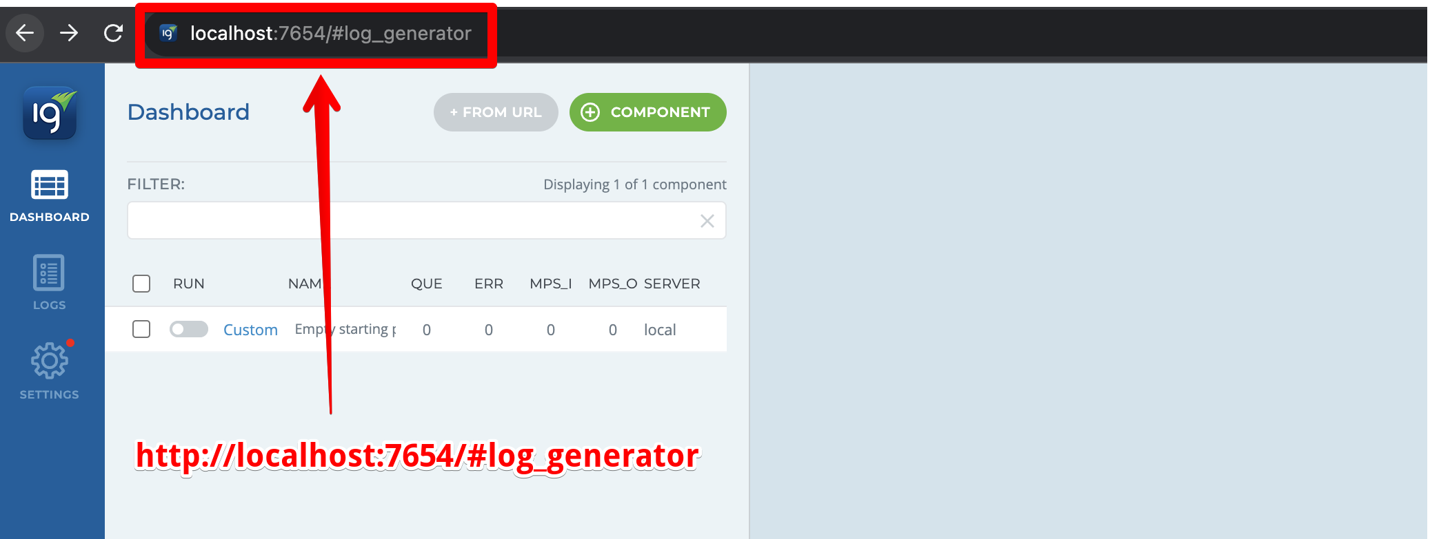 Type the URL ( http://localhost:7654/#log_generator) into the bar like the screenshot below: