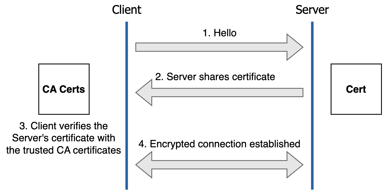 In this configuration, the server presents a certificate and the client validates the server's identity.
