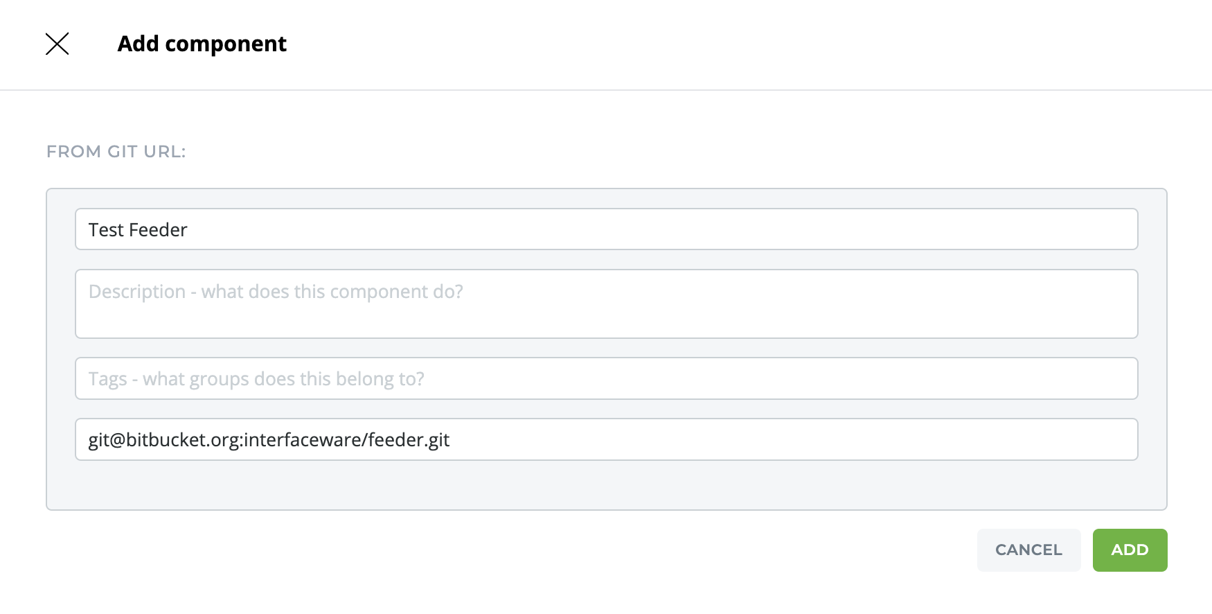 STEP 2: Fill out the Add component dialog - say with git@bitbucket.org:interfaceware/feeder.git