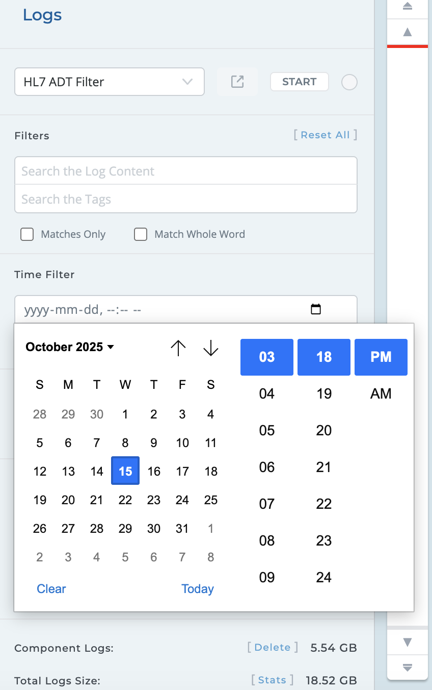 Either manually enter or use the calendar icon to select a start and end time range to filter log entry results.
