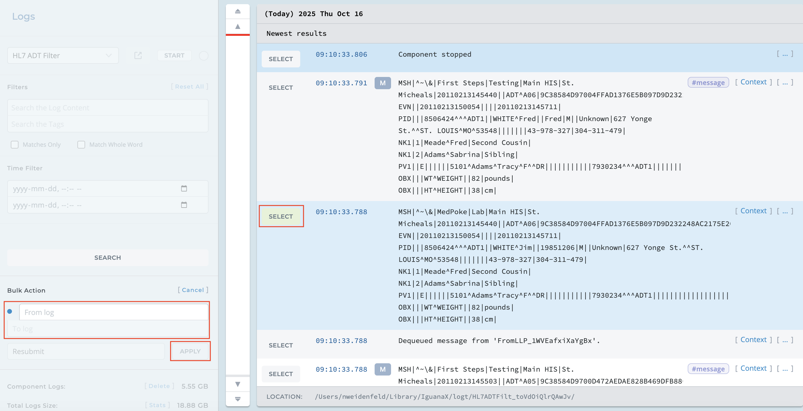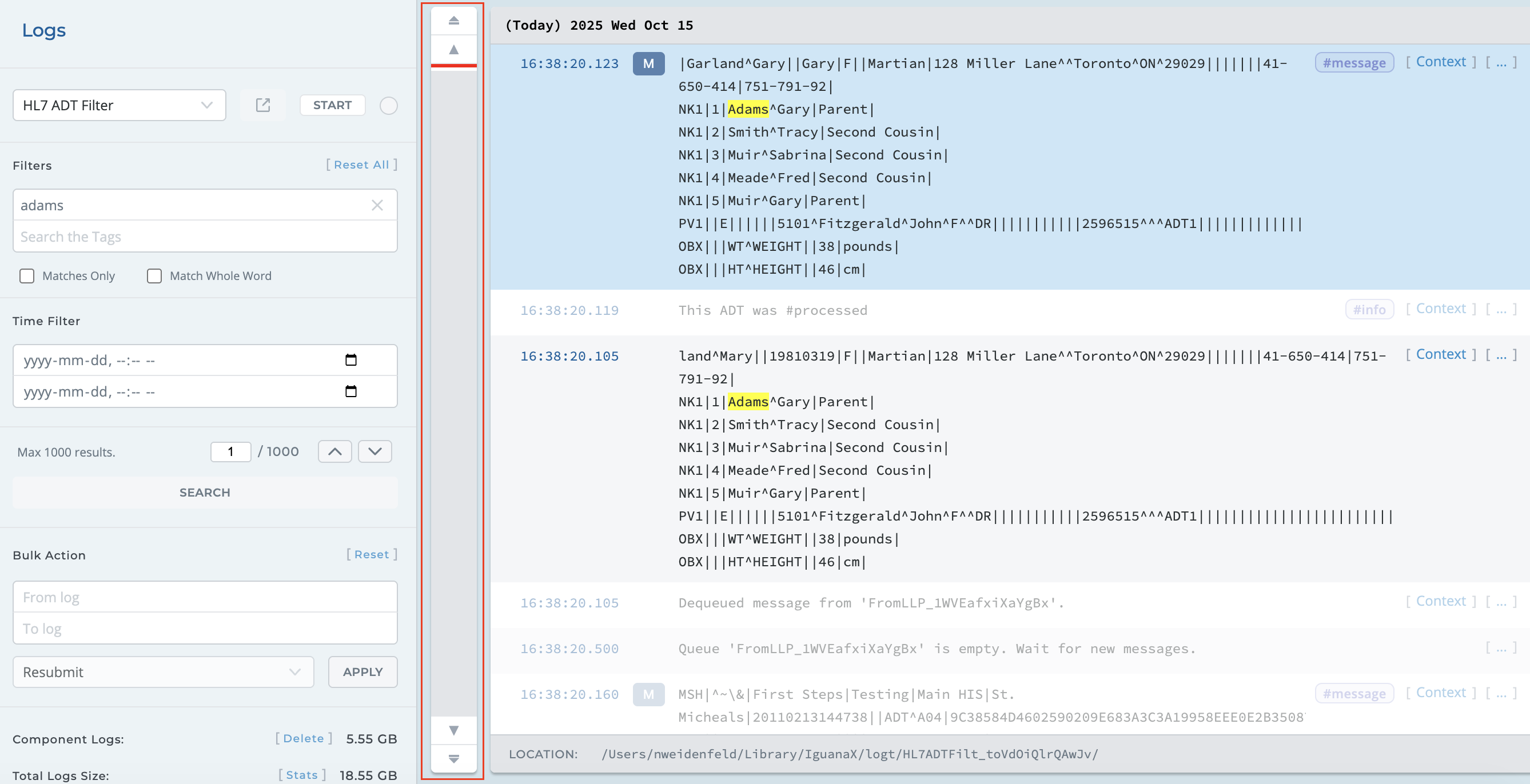 You can quickly search and filter through the IguanaX Logs: