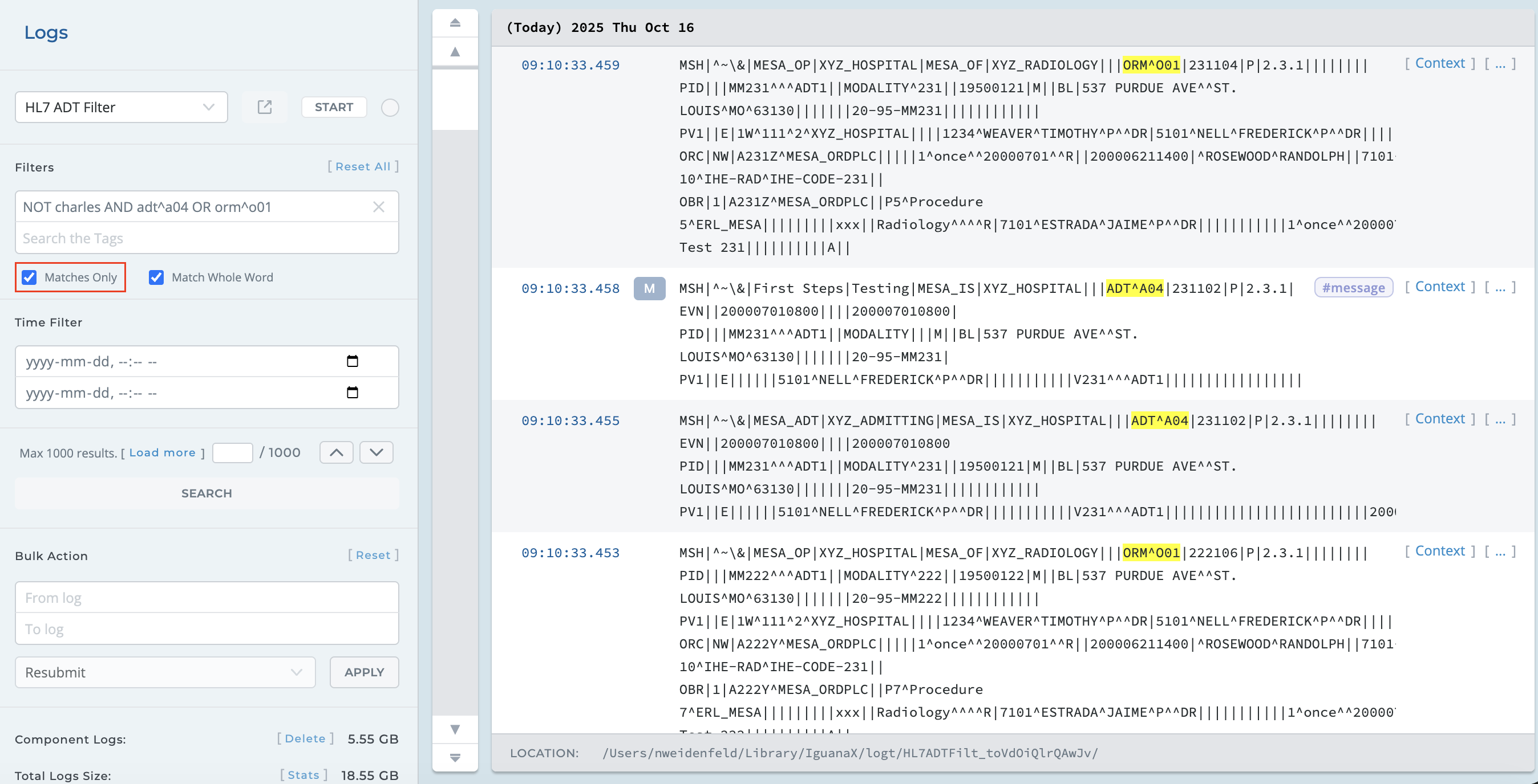 Therefore, if you wanted to search for log messages that did not include patients named “Charles”, and had a message type of ADT^A04 or ORM^O01, your search would look something like this: