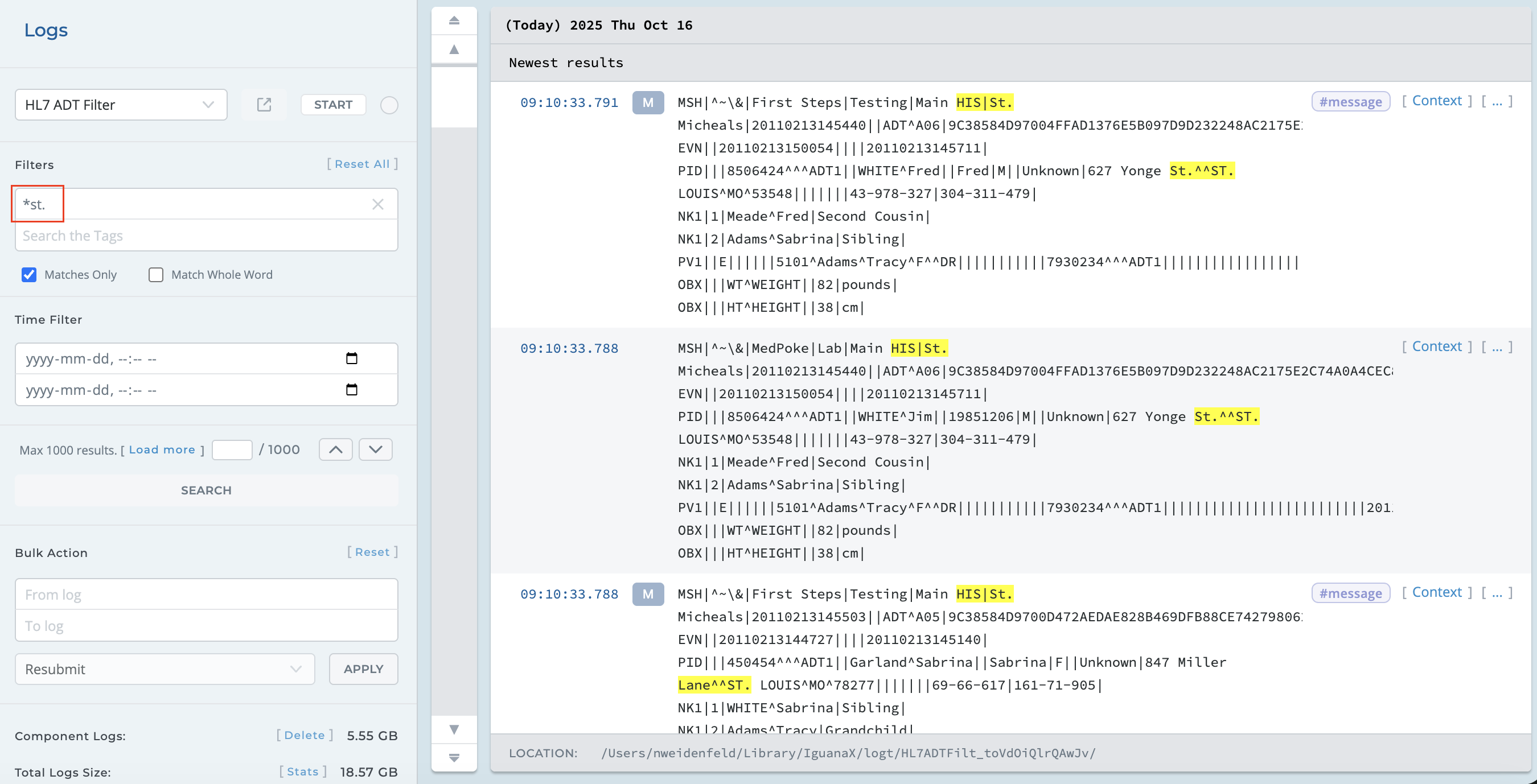 Notice that some of the log entries above are greyed out. If you select Matches Only, Iguana will display only the log entries that match the search criteria.