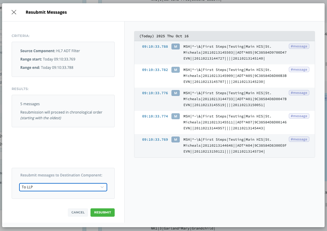 A summary pop-up will appear, allowing you to review the action and select the component to which the messages should be resent.