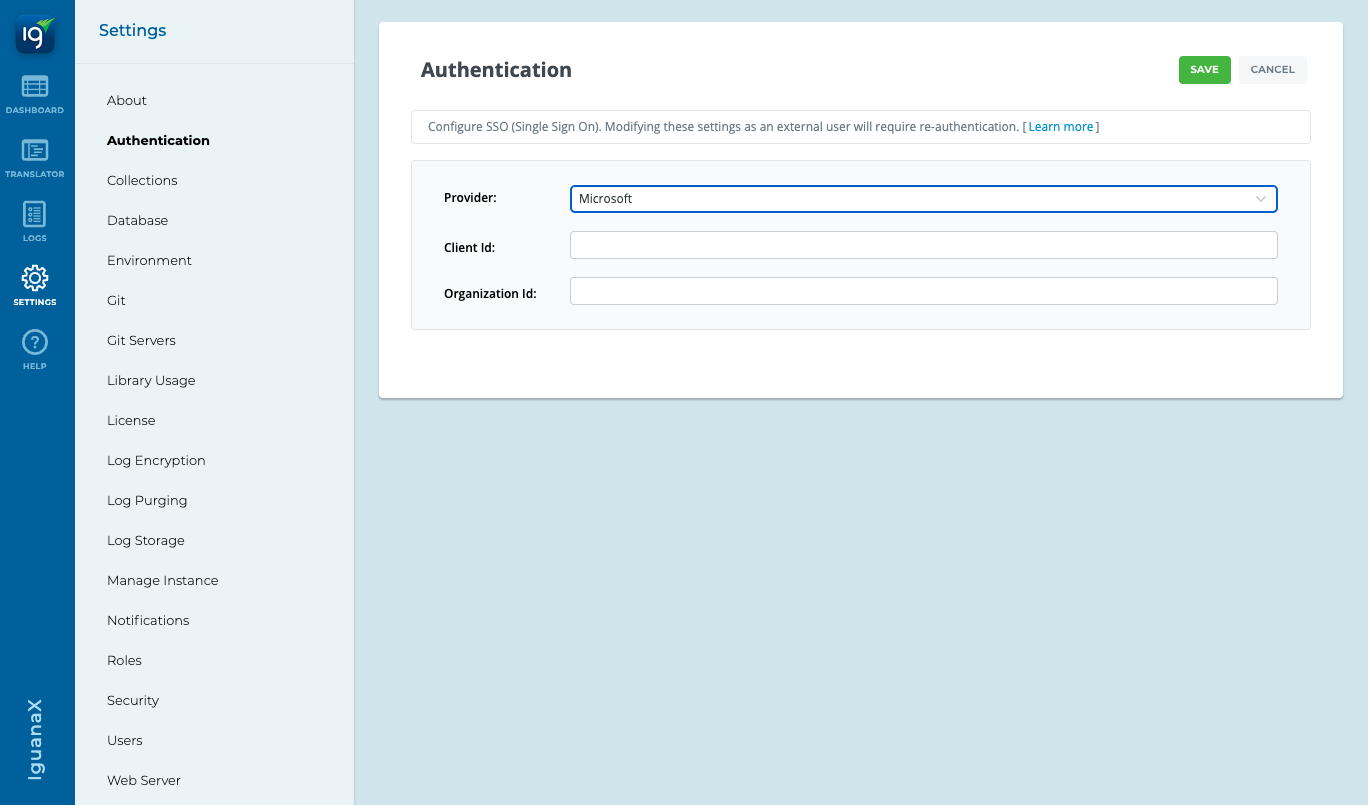 Open IguanaX, and go into the Authentication page from the Settings menu. From the Provider drop-down list, select Microsoft.