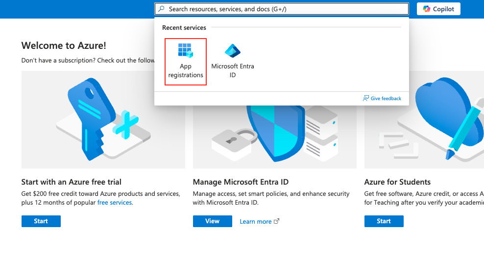 Log into your Azure Portal. In the top search bar, type App Registrations, then select it.