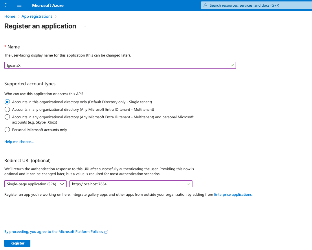 Under “ Supported account types”, select “ Accounts in this organizational directory only (Default Directory Only - Single Tenant)”. This will ensure that the application only exists within this Azure directory, and will not span multiple directories.