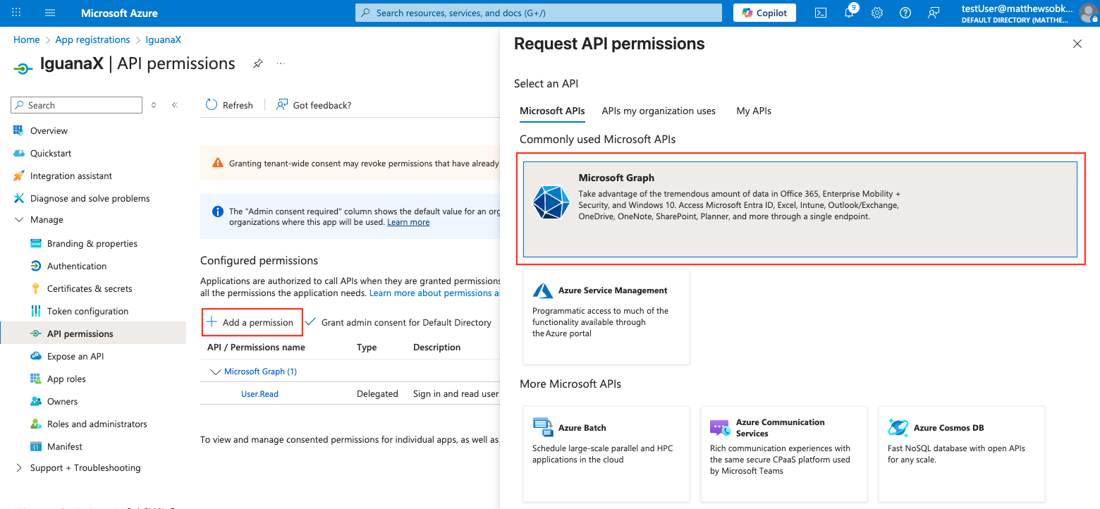 In the left-hand navigation, select API Permissions. You'll see a default permission listed, usually User.Read.