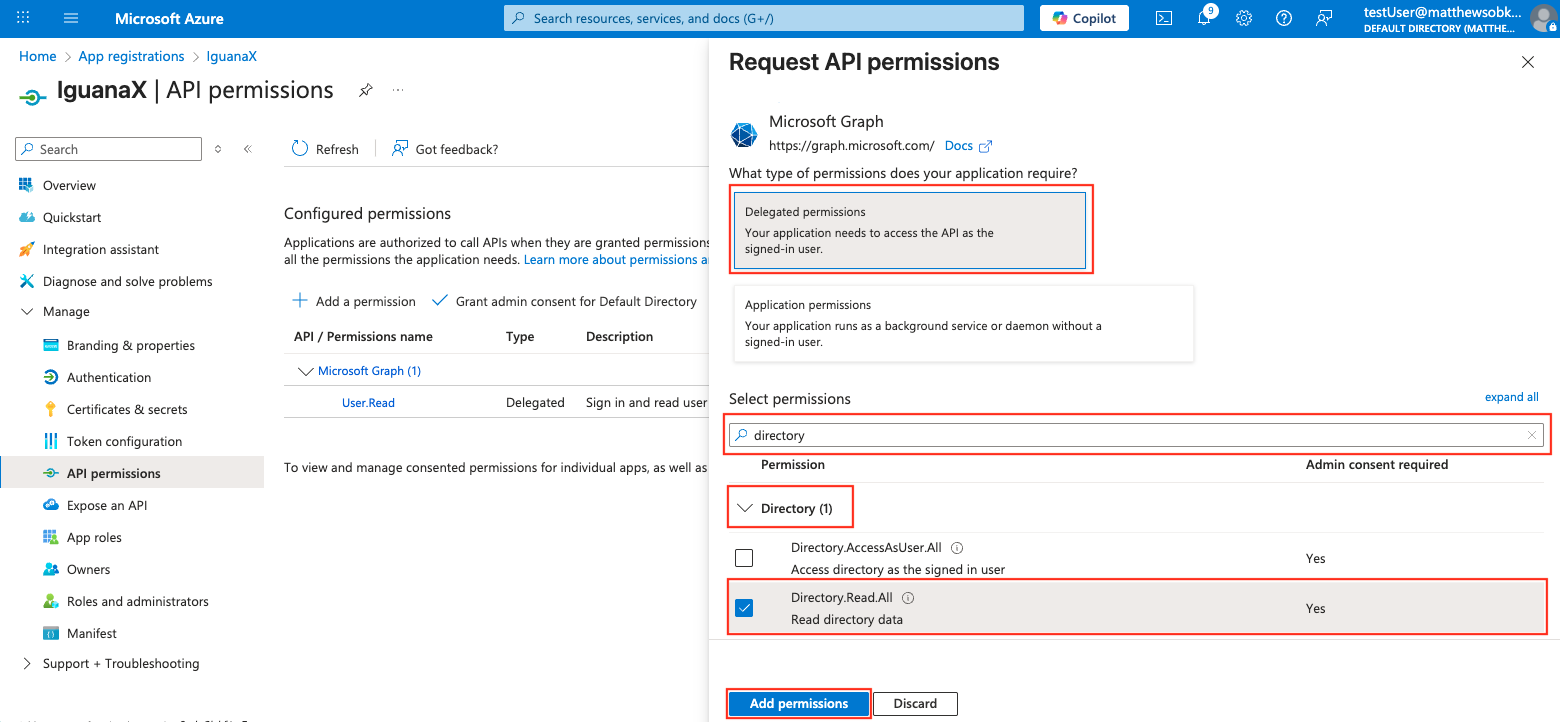 Select Delegated permissions, then search for “Directory” in the Search Permissions search box, select Directory and then Directory.Read.All. Click Add permissions.