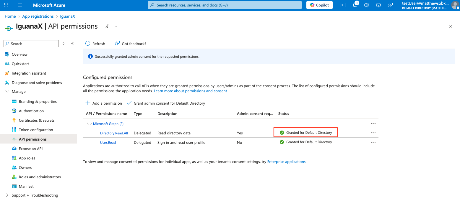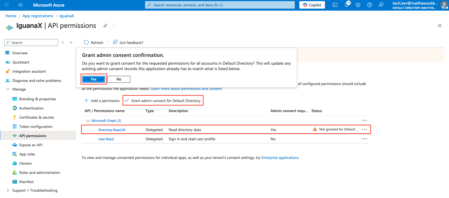 You'll now see “ Directory.Read.All” listed as part of your API permissions. Click on Grant admin consent for Default Directory, and confirm by clicking Yes on the pop-up.