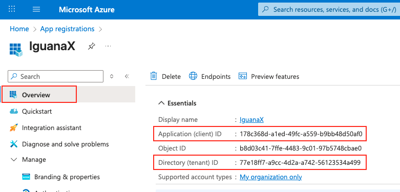 Using the left-hand navigation menu, return to the Overview page of the app registration. Copy the Application (client) ID and the Directory (tenant) ID.