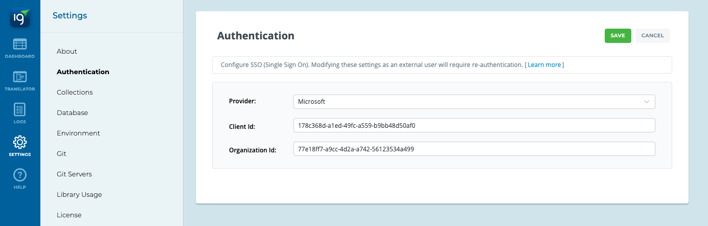 Go back into IguanaX and paste the Application ID into the Iguana Client ID field, and the Directory ID into the Organization ID field. Click Save.