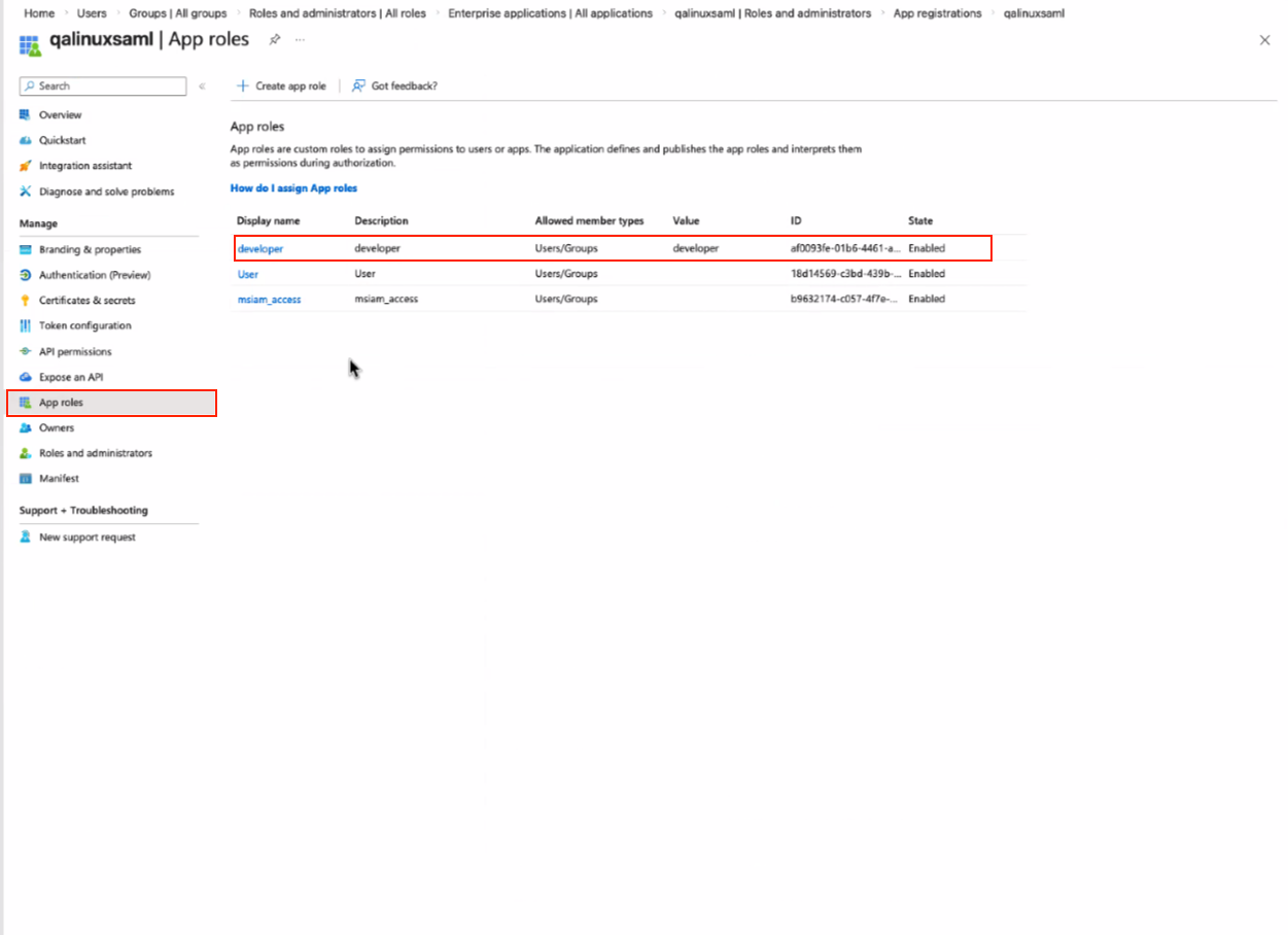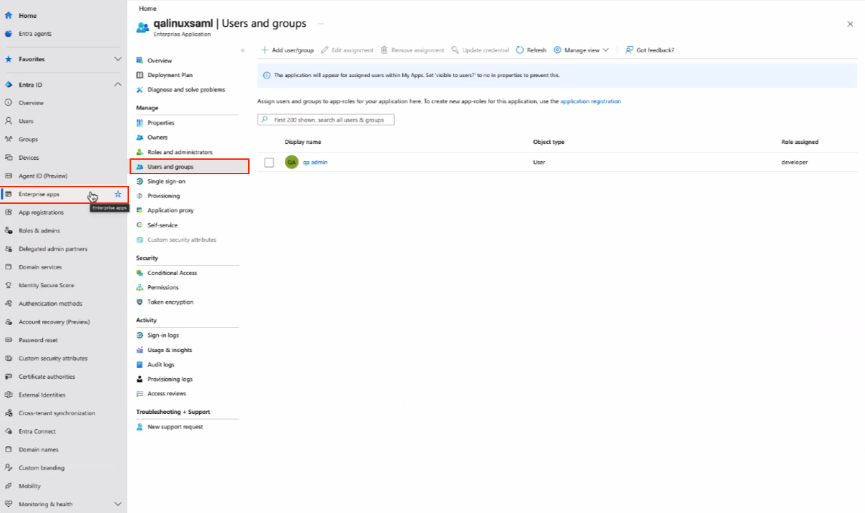 Under Enterprise apps → Users and groups assign users/groups to roles created in the previous step: