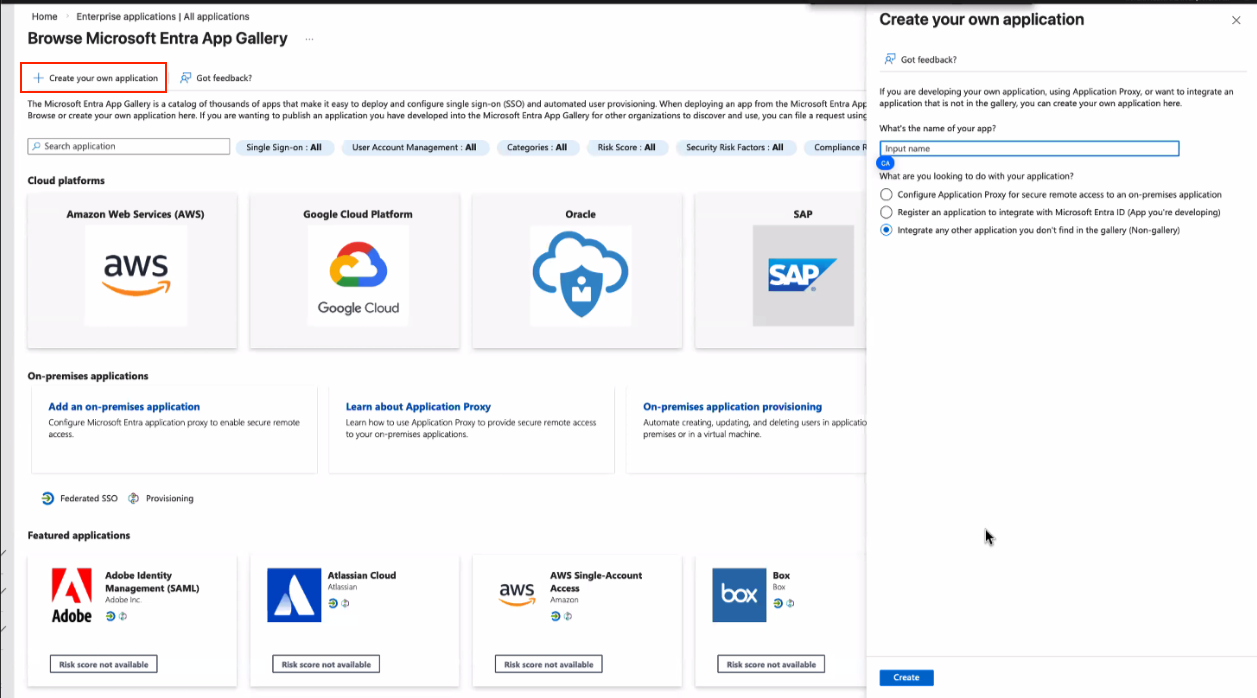 Under the “enterprise applications” section of Microsoft Azure, select create your own application. When creating the application, select “(Non-gallery)”.