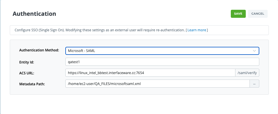 In IguanaX under Settings → Authentication configure the authentication details for the Microsoft SAML application. In the ACS URL section, simply include the DNS of the IguanaX instance (do not include /saml/verify). The Metadata path should point to the metadata file downloaded in step 2.