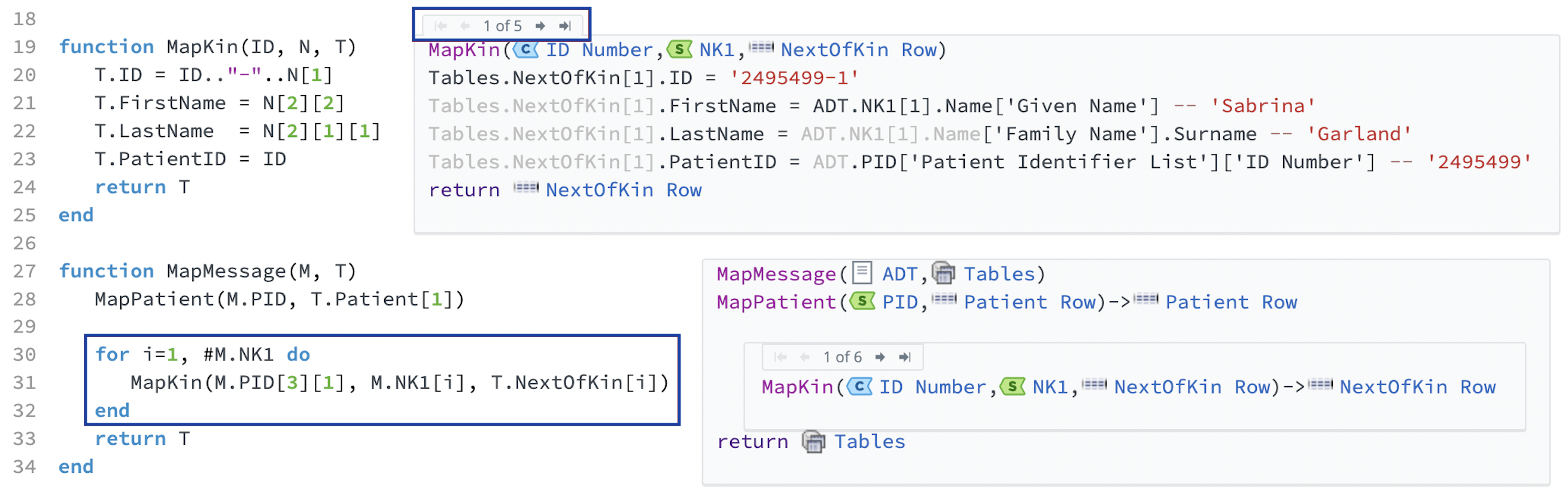 Functions which are called multiple times have a navigation control at the top which lets you select the iteration of the function. See how the for loop mapping kin has a sub window with a navigation control?