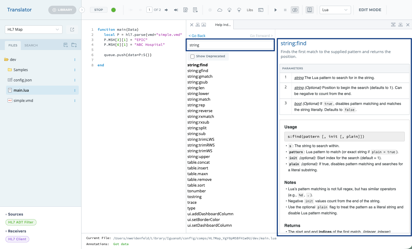 All of Iguana's APIs are documented and accessible from within the Translator. You can search through the Help Index to review: