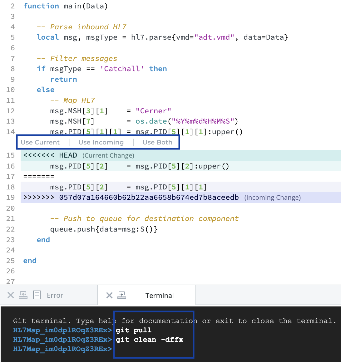 When changes are pulled down, you can clearly view the changes. This process involves reviewing and resolving the merge conflicts- you can view the incoming changes and choose to: