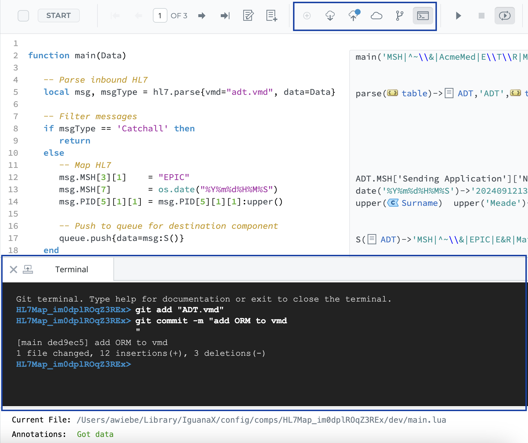 The Translator leverages Git for efficient code promotion and developer collaboration. You can interact with you connected upstream repository via the menu bar icons or the Git Terminal:
