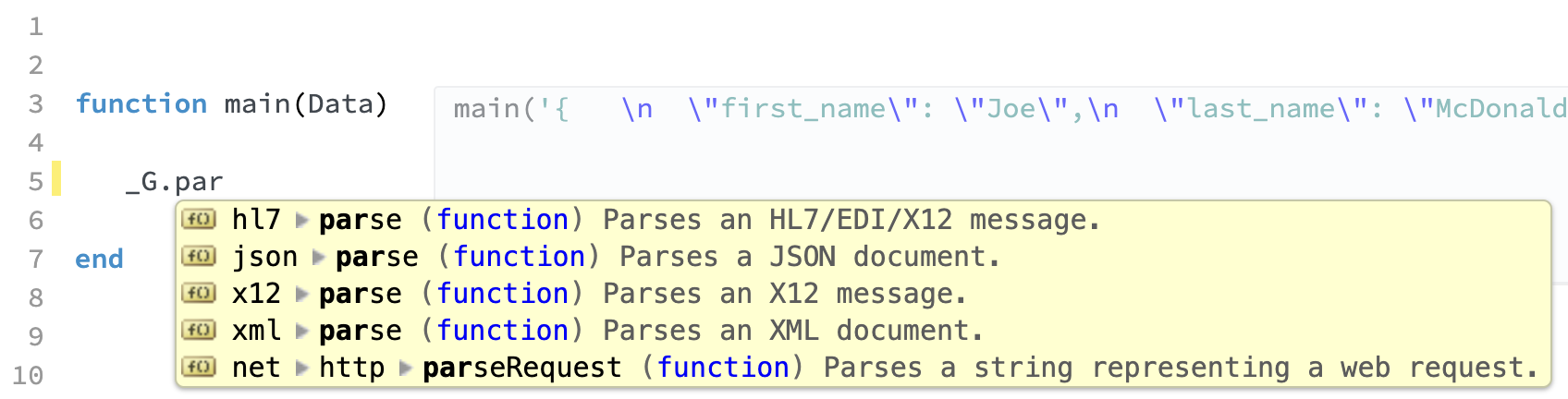 This can also be helpful when leveraging deep Auto-Completion, if you know roughly what you are looking for. For example, by typing _G.par we can see all the parsing related functions: