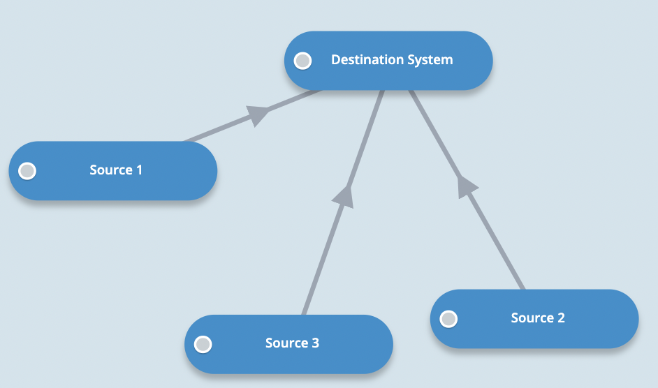 This integration type involves multiple systems or sources feeding data into one central system. The focus is on gathering data from various systems into a single application or platform.
