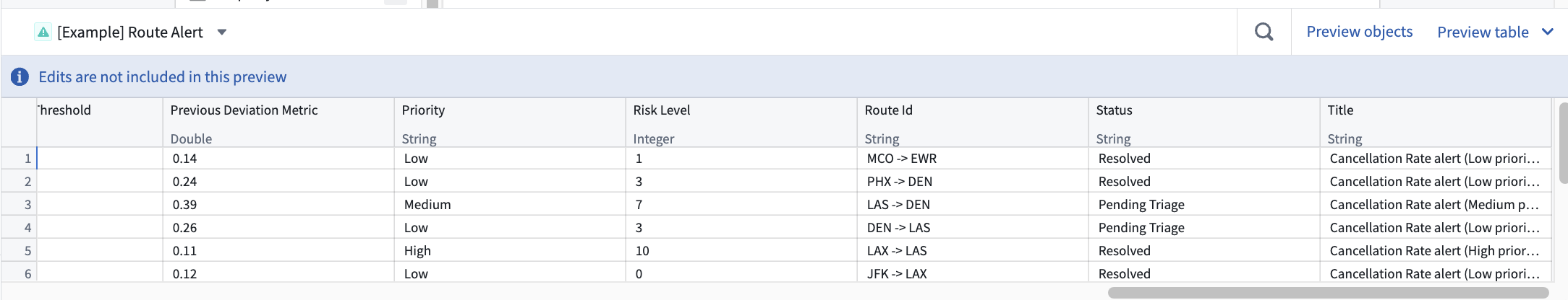 This app creates the Example Route Alert and related object types used in the demo searches and status update workflow below.