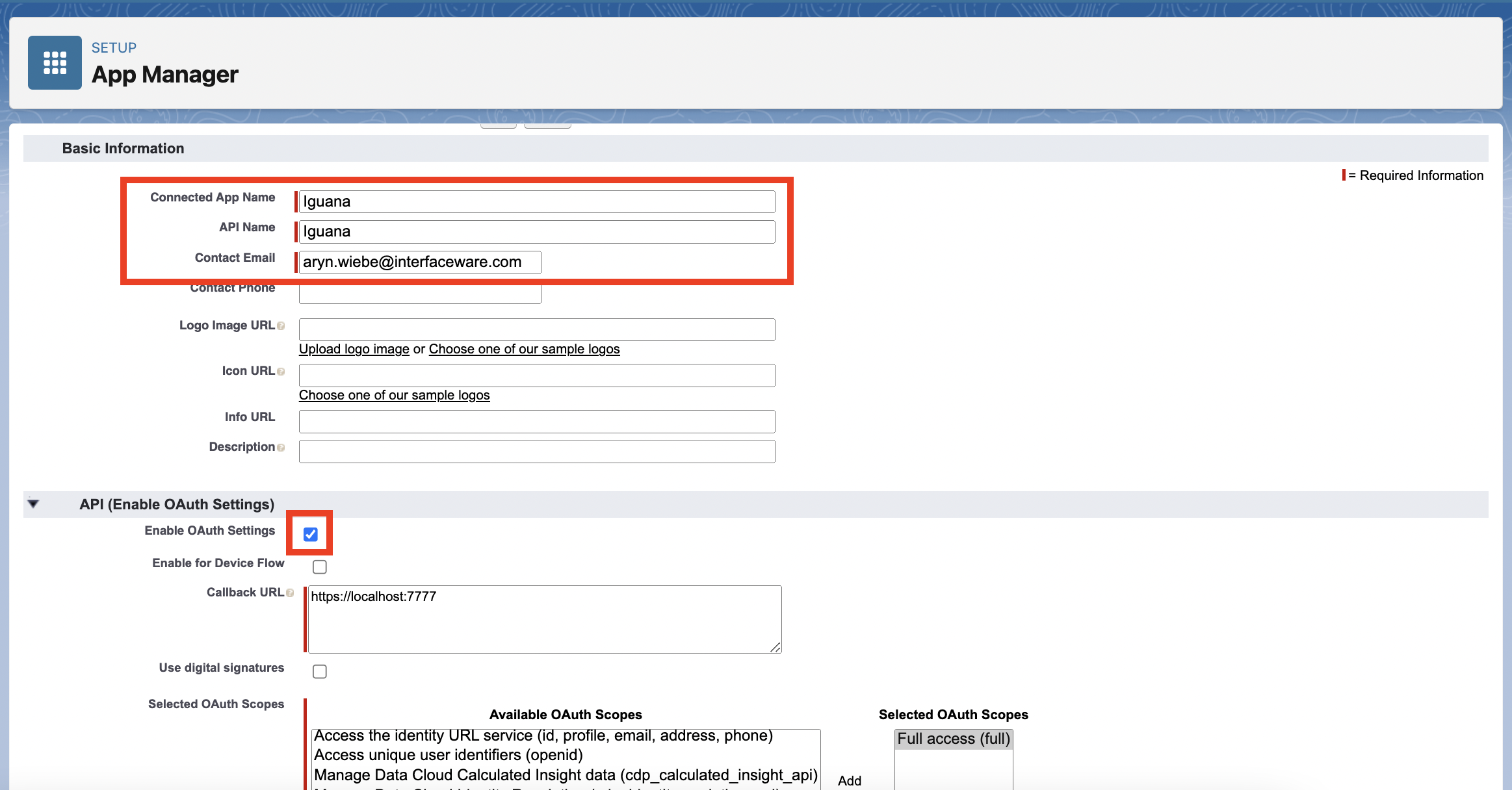Fill in the required Basic Information. Click Enable OAuth Settings and include a required Callback URL and OAuth Scopes (Here we have selected full access for ease of development).