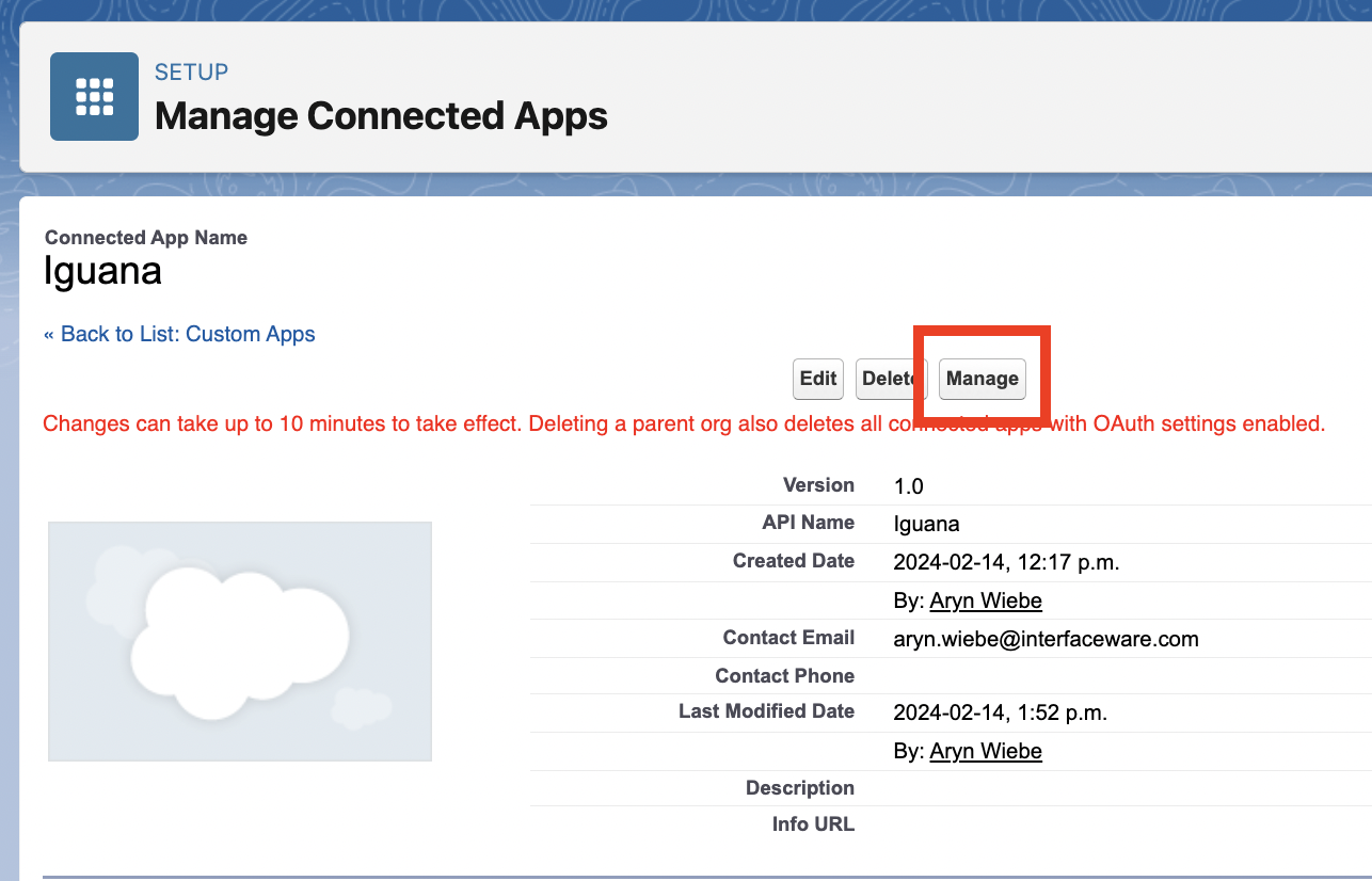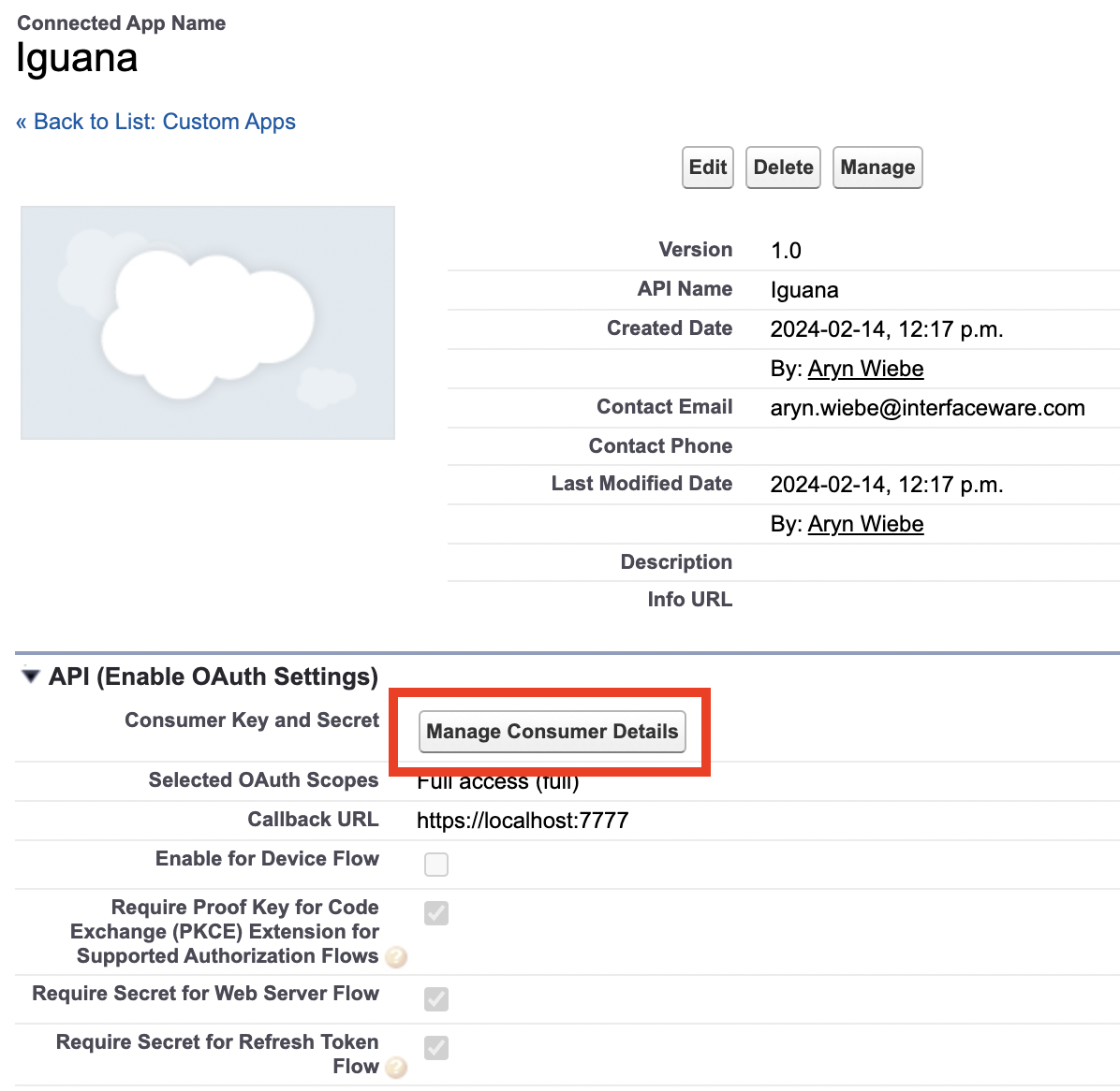 In your App, click Manage Consumer Details. A verification code will be sent to your email to be entered before continuing the page displaying your App Consumer Key and Consumer Secret. Copy these two values to use in the Iguana Salesforce Adapter.
