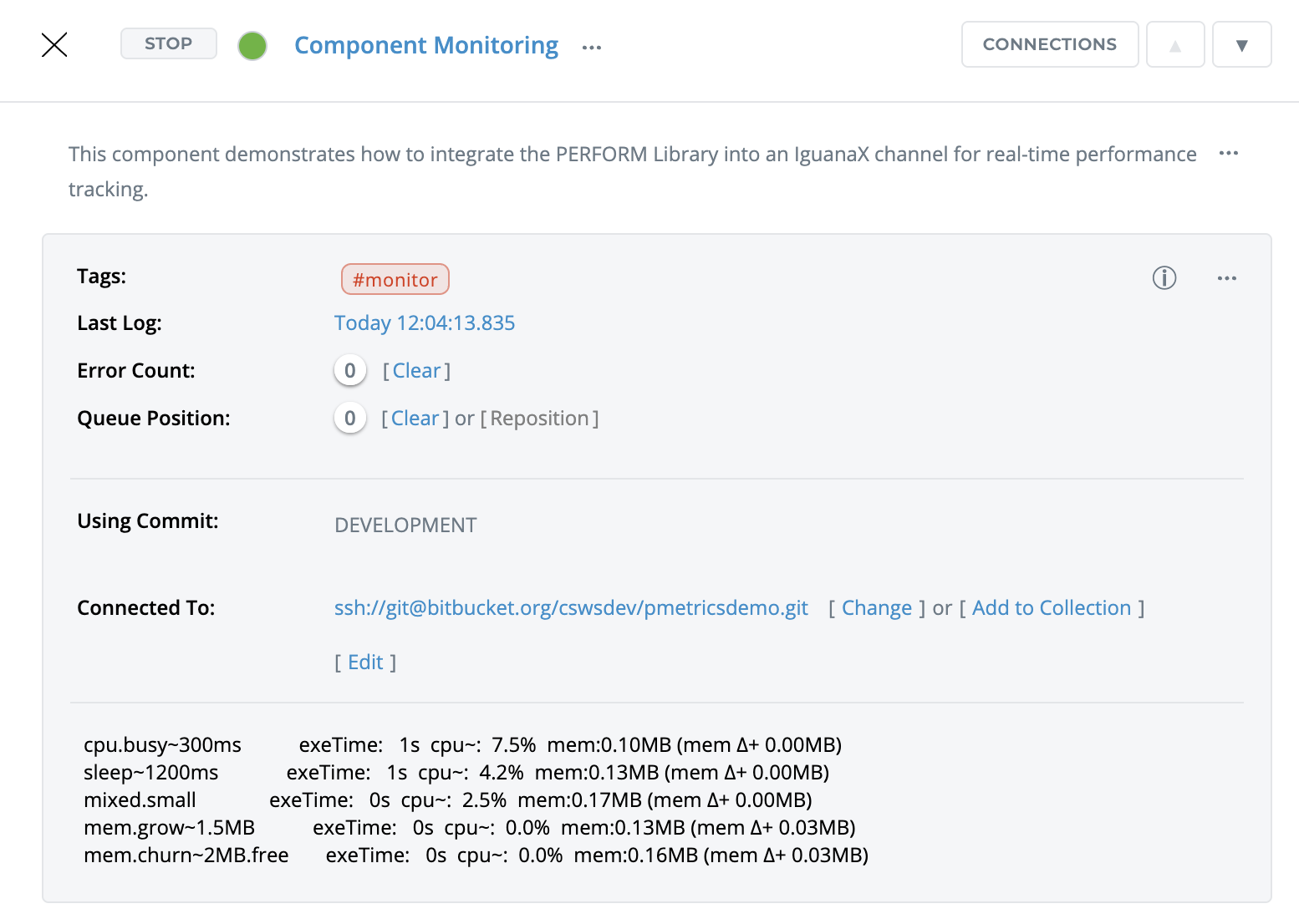 This component demonstrates how to integrate the PERFORM Library into an IguanaX component for real-time performance tracking. It showcases CPU load, wall execution time, and memory footprint monitoring for simulated workloads.