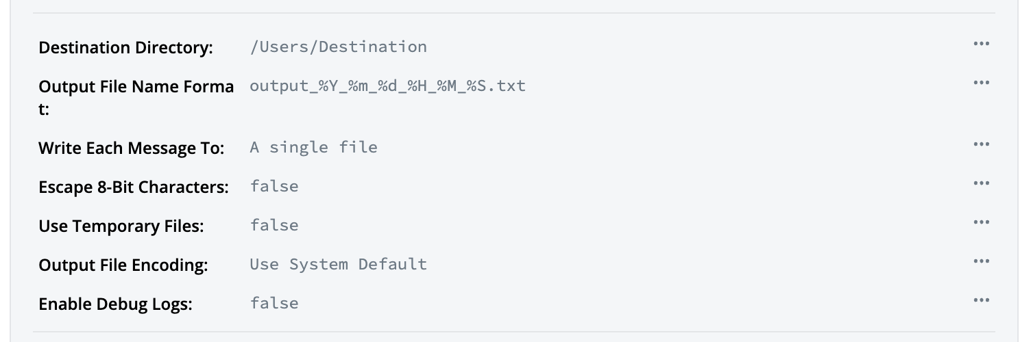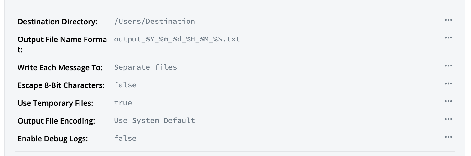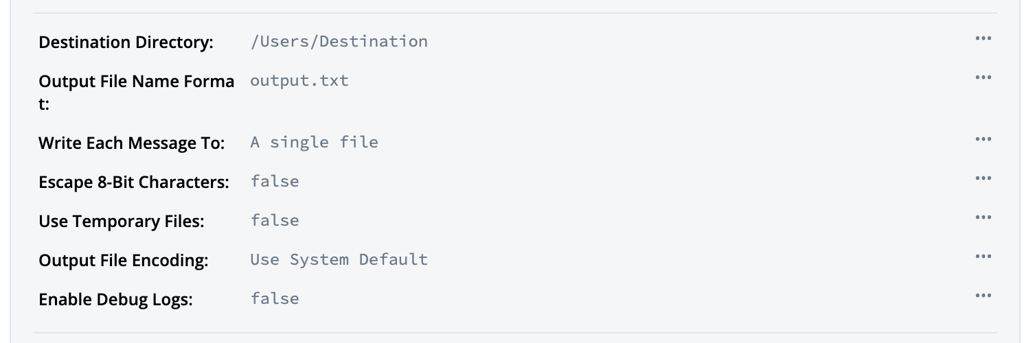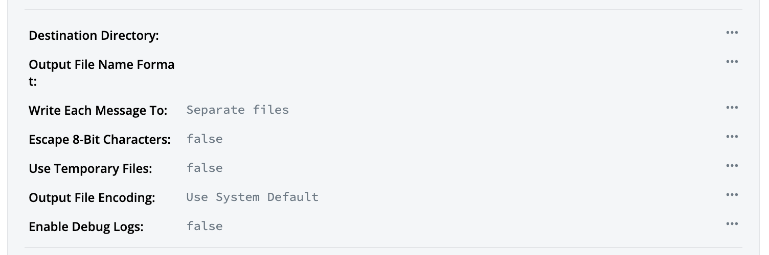 Destination Directory | The directory where the output file(s) will be stored. The adapter will attempt to create it if it does not exist. | |