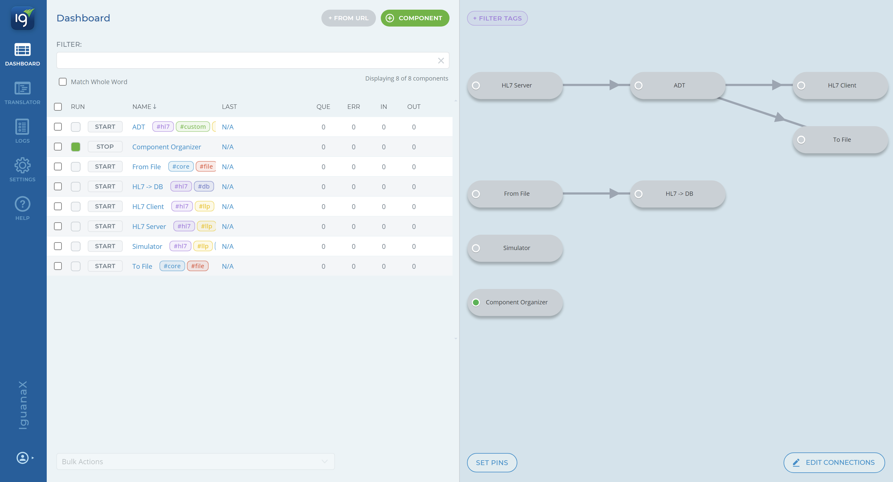 Integrations are often made up of a chain of components. The Component Organizer can be used to organize those components and pin them on an individual User's IguanaX Dashboard, making it easier to visualize and manage complex integrations.