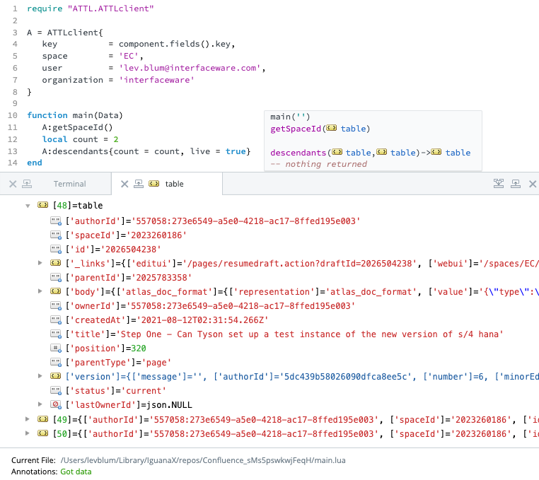 Right after declaration of Client instance and passing the parameters to it, we discover the Confluence Space ID. This value couldn't be known without running this API call.