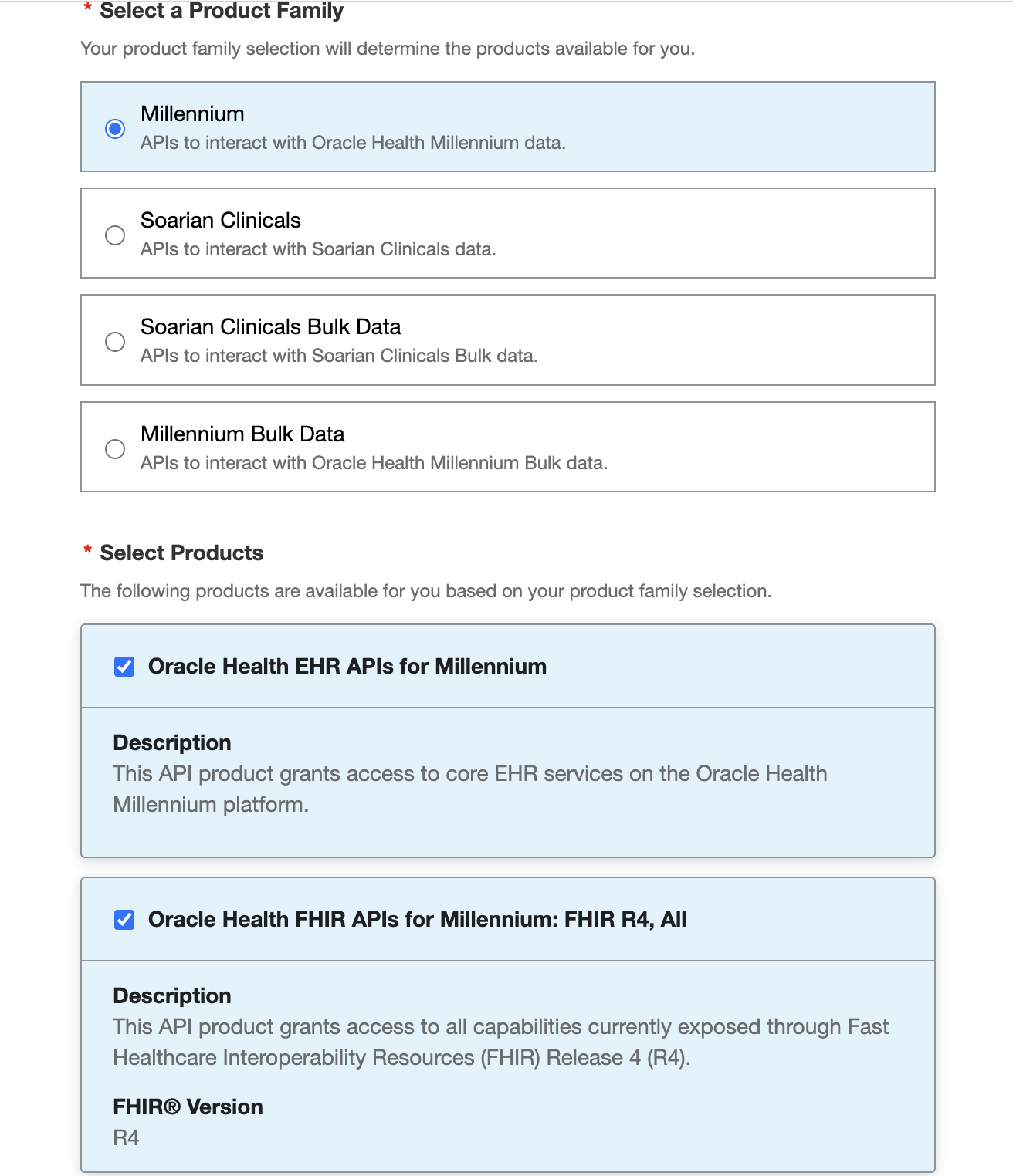 The core one that we care about is Oracle Health FHIR APIs for Millennium: FHIR R4, All