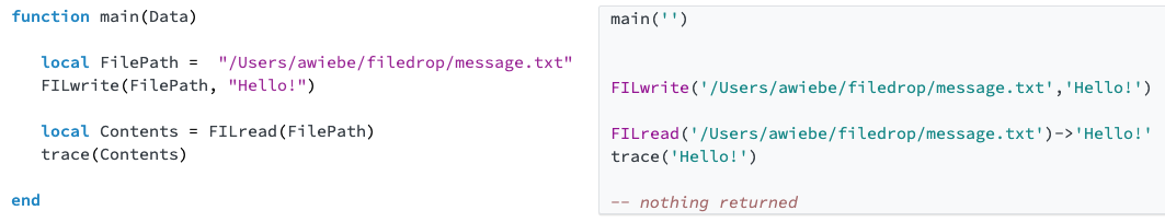 Similarly, for reading a file with FILread, the FileName is passed, opened in “rb” binary read mode for the entire (“*a”) contents of the file to be read using io.read().