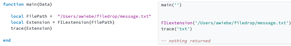 The FILextension function takes the filename and uses String:match() and Pattern Matching to match and return the file extension (LastDotIndex). Conditional logic ( if statements) is used to return the extension or an empty string if it does not exist.