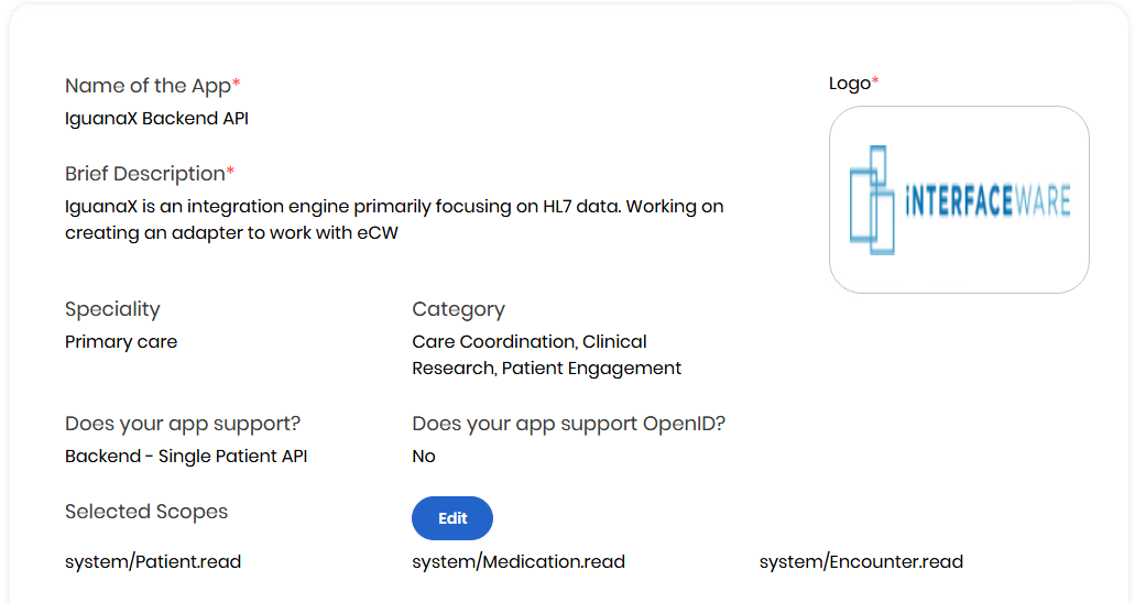 eCW offers a testing sandbox to interact and develop against their FHIR Server. If you want to try out the eCW Adapter in Iguana X, you'll first need to login or signup for an eCW developer account and create an App: