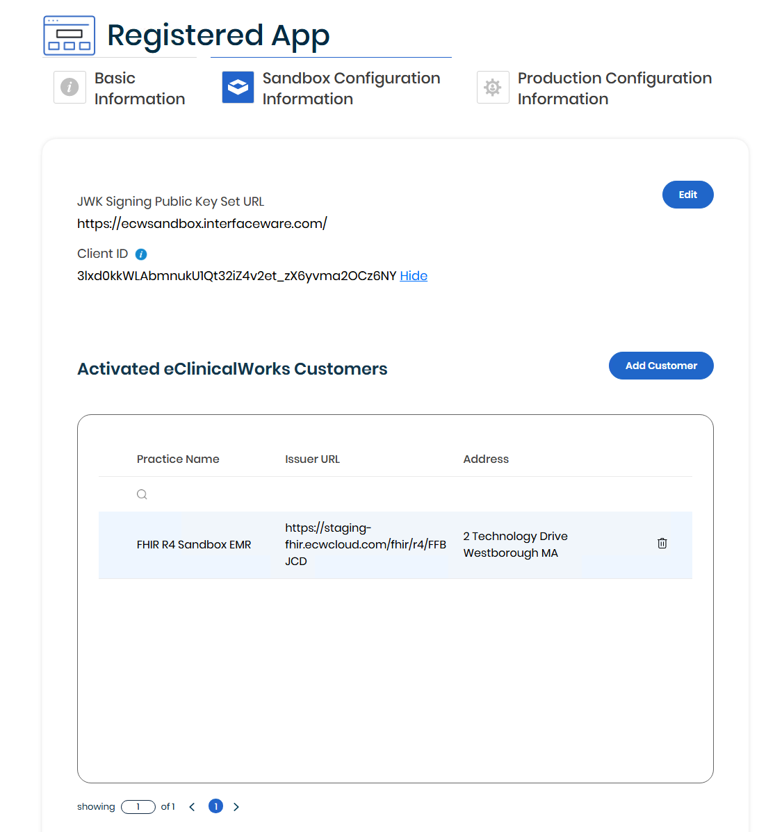 Copy your Client ID from the Sandbox Configuration Information page of your registered app, as well as the Kid value of your JWKS. These values will be required to use the eCW Adapter.