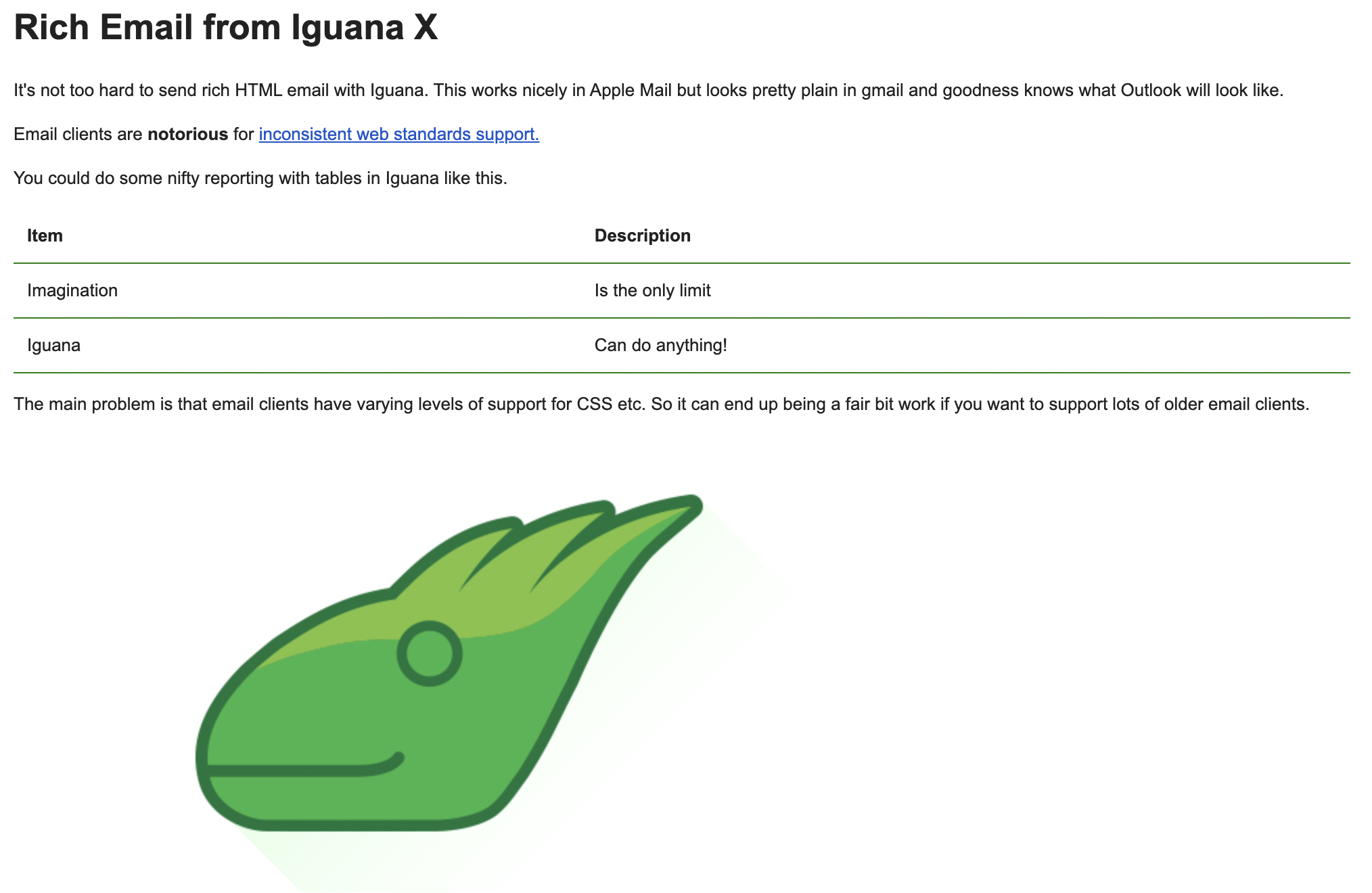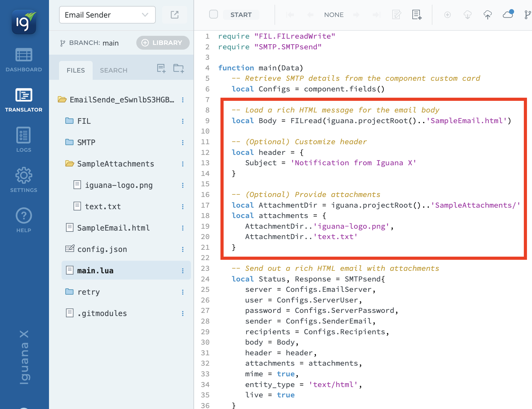 The component is designed to be simple to adapt. The SMTP library takes care of constructing the MIME headers and attachments. By default, the component uses a sample HTML and Iguana logo PNG included in the project. Simply modify the code in main.lua to change the content of your email.