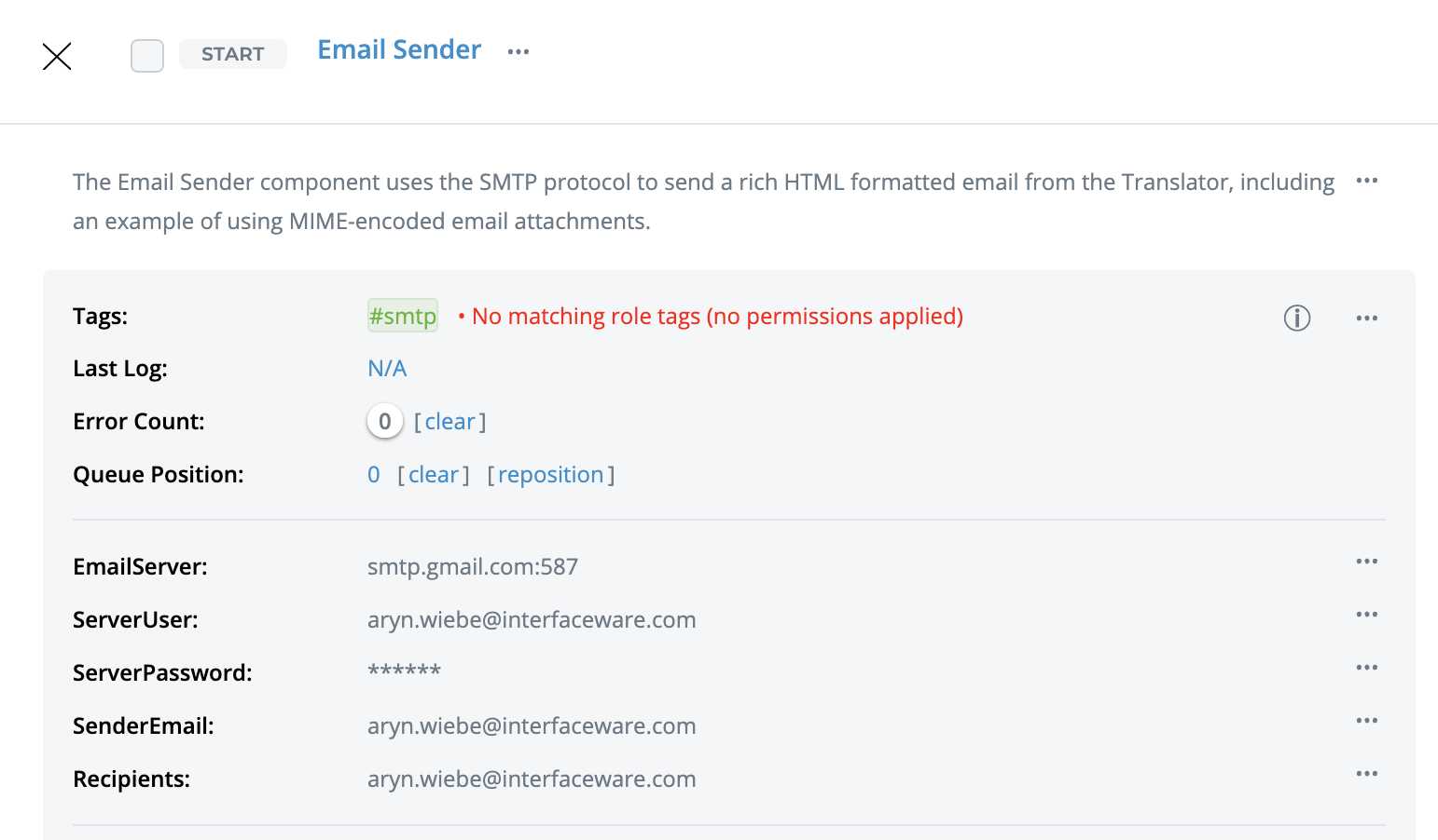 The Email Sender component uses the SMTP protocol to send a rich HTML formatted email from the Translator using the SMTP Library. This component includes an example of sending MIME-encoded email attachments, by simply formatting the body of the SMTP message with both MIME headers and encoded attachment contents.