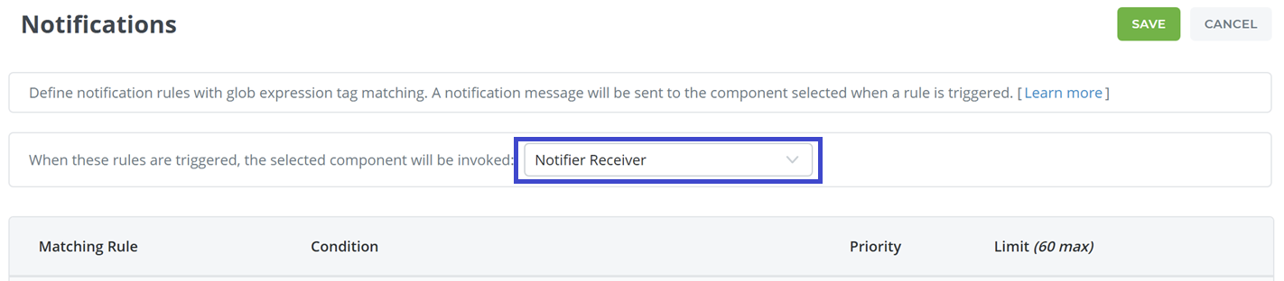 While the component is running, the notification system sends log messages to the Notifier Receiver whenever a notification rule is triggered. The component splits the data into individual log messages and pushes them to the downstream component's queue.
