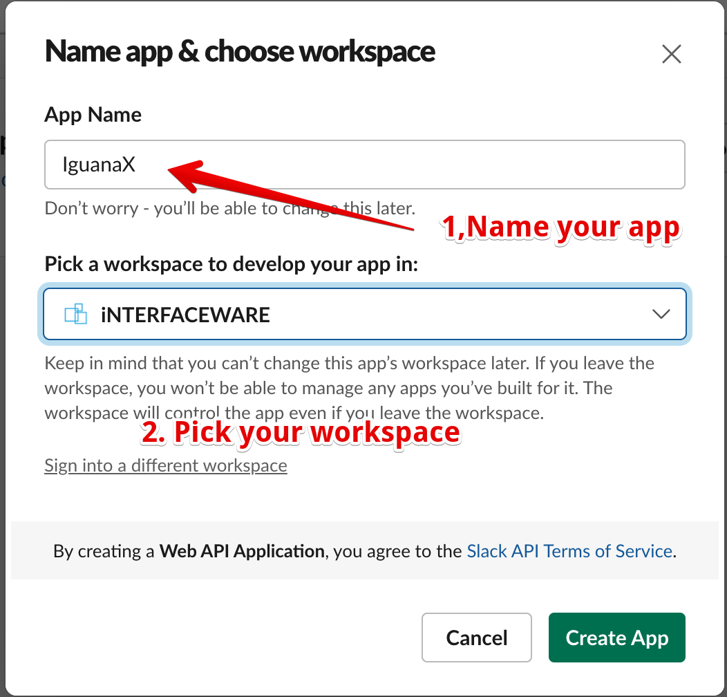Then fill in the name of your app - IguanaX and select your workspace