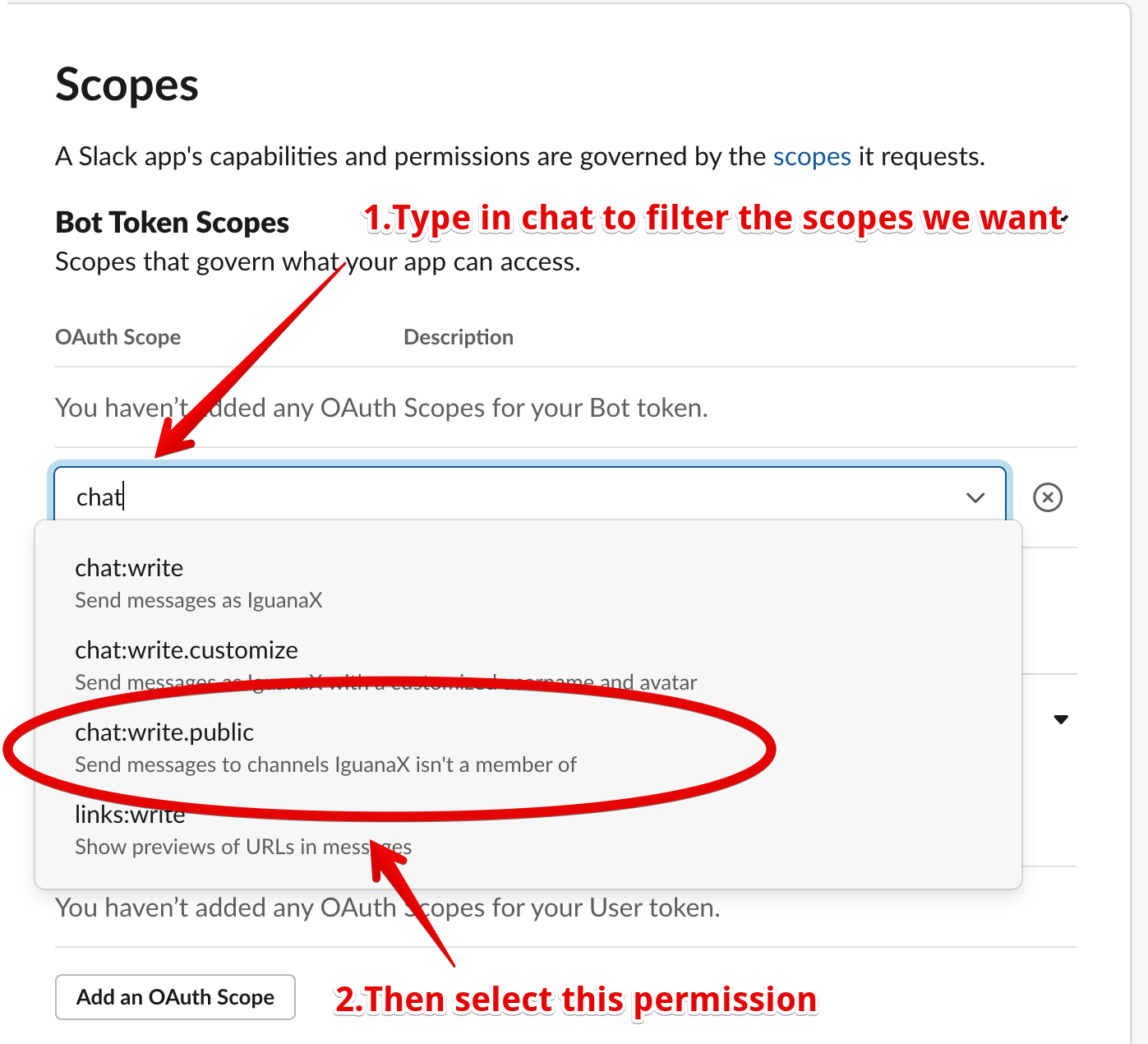The trick here is to enter the scopes you are searching for like for chat:write.public we have: