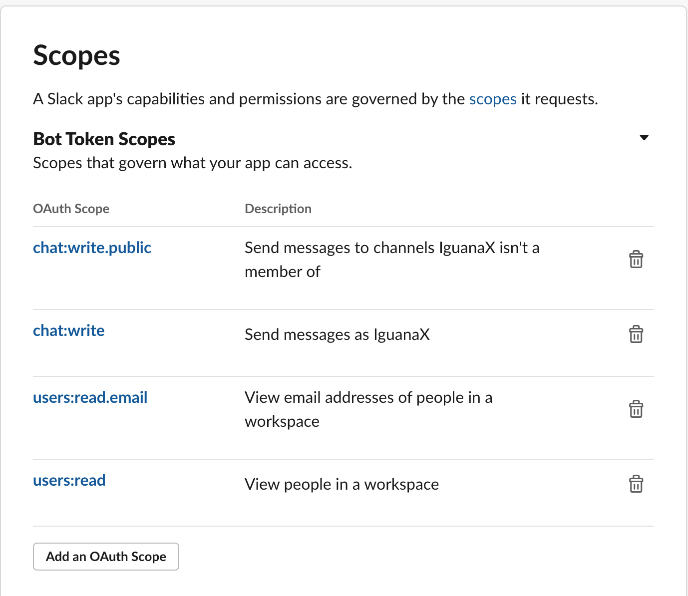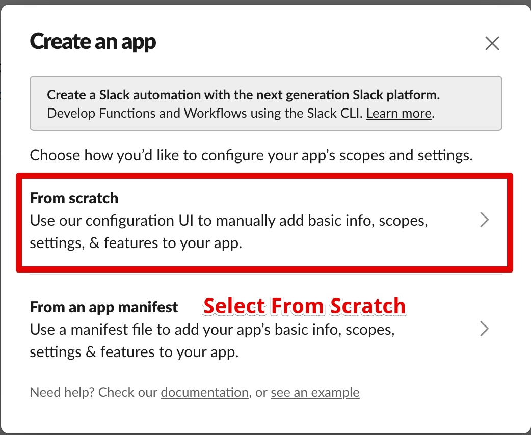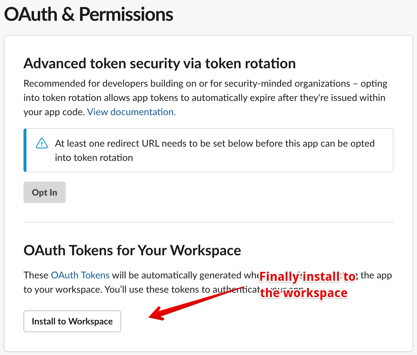This is common concept when setting up a Private app. We have to tell Slack what the app is allowed to access.