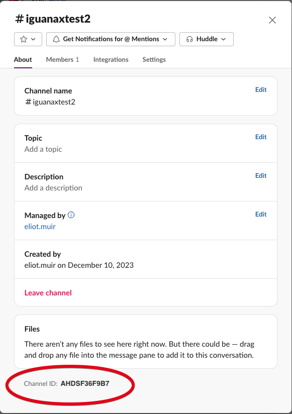 Each Channel in Slack has a unique ID. To find it, in the regular Slack application, right click on a channel you want to write to the app and select the View channel details