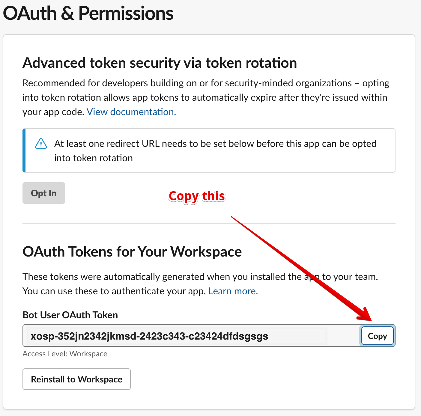 and then you get the gold - the Api Key which Slack calls a Bot User OAuth Token.
