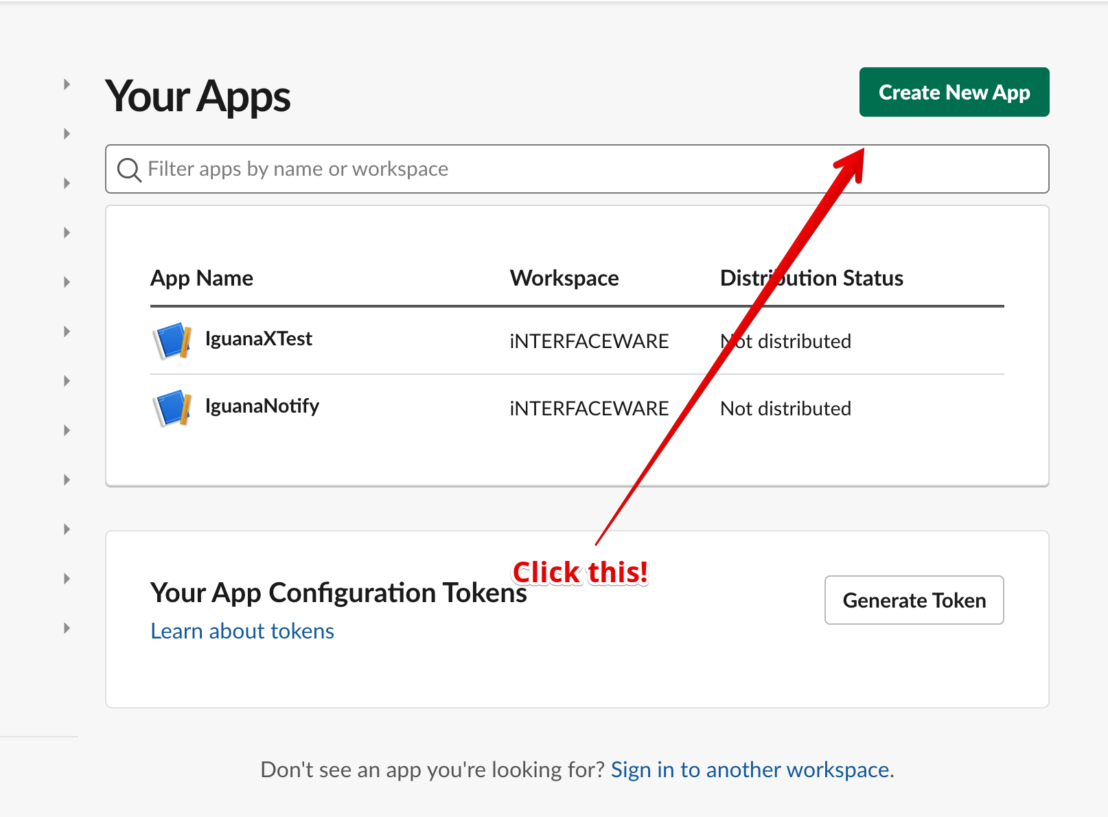 We need to go through's Slack's process to create a Private app. Effectively we need to set up a password that Iguana can use to talk to Slack.