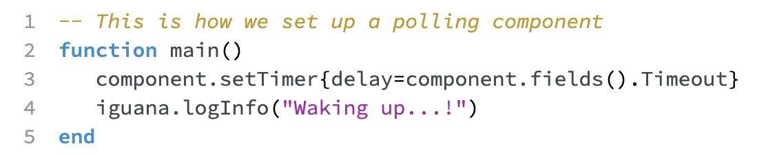In the Translator, you'll see this is a very simple script leveraging one of the Component APIs, component.setTimer to set the component poll time.