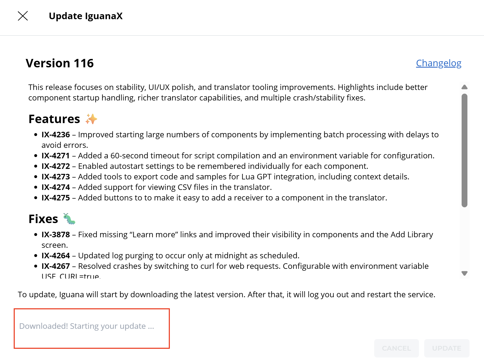 Update gets stuck and won't proceed past the popup saying “Downloaded! Starting your update …”: