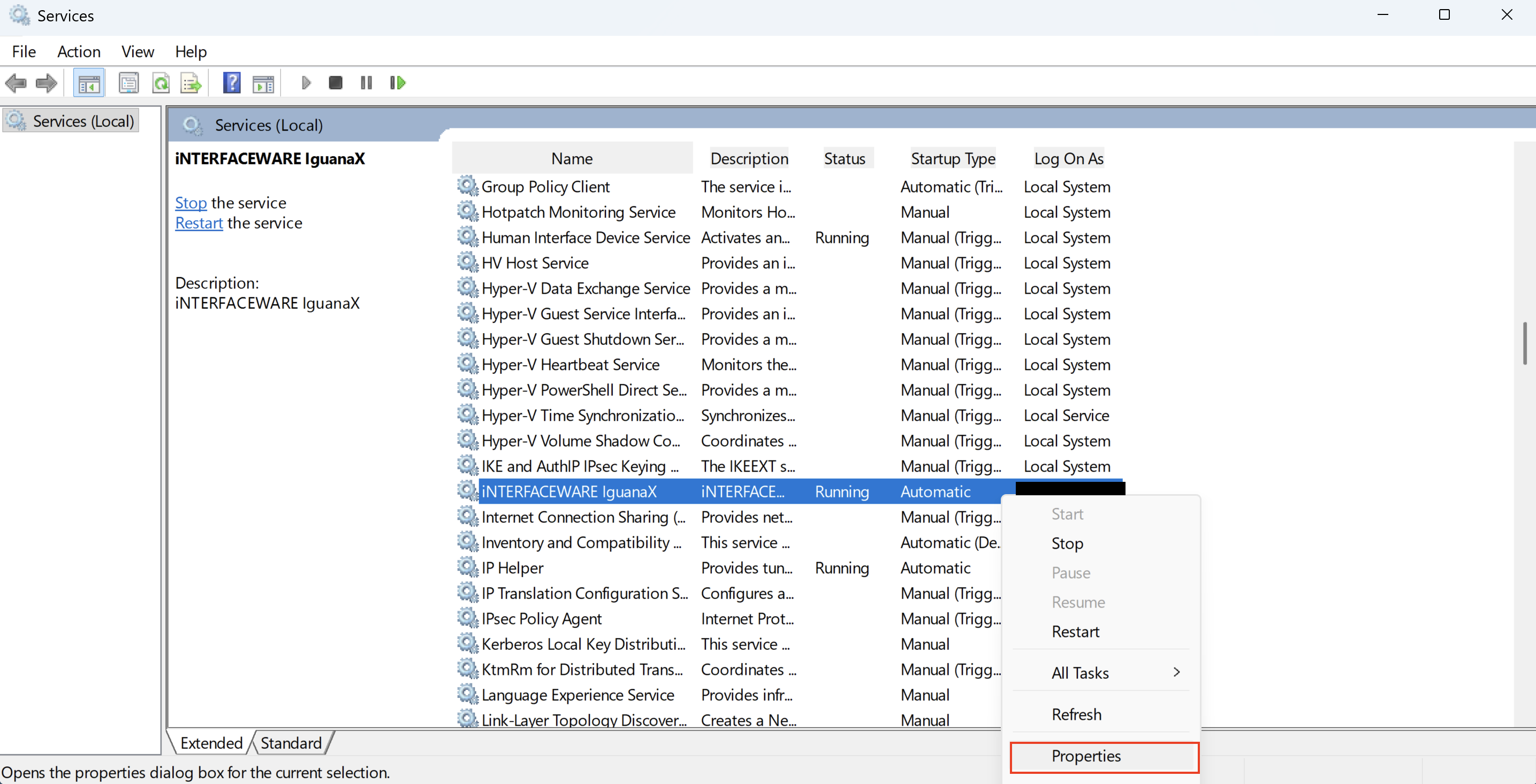 Stop all components. (Note, if you want to minimize any unnecessary downtime you could instead stop all components after you change the “Log On As” user and before stopping and restarting the IguanaX Service in the steps below).